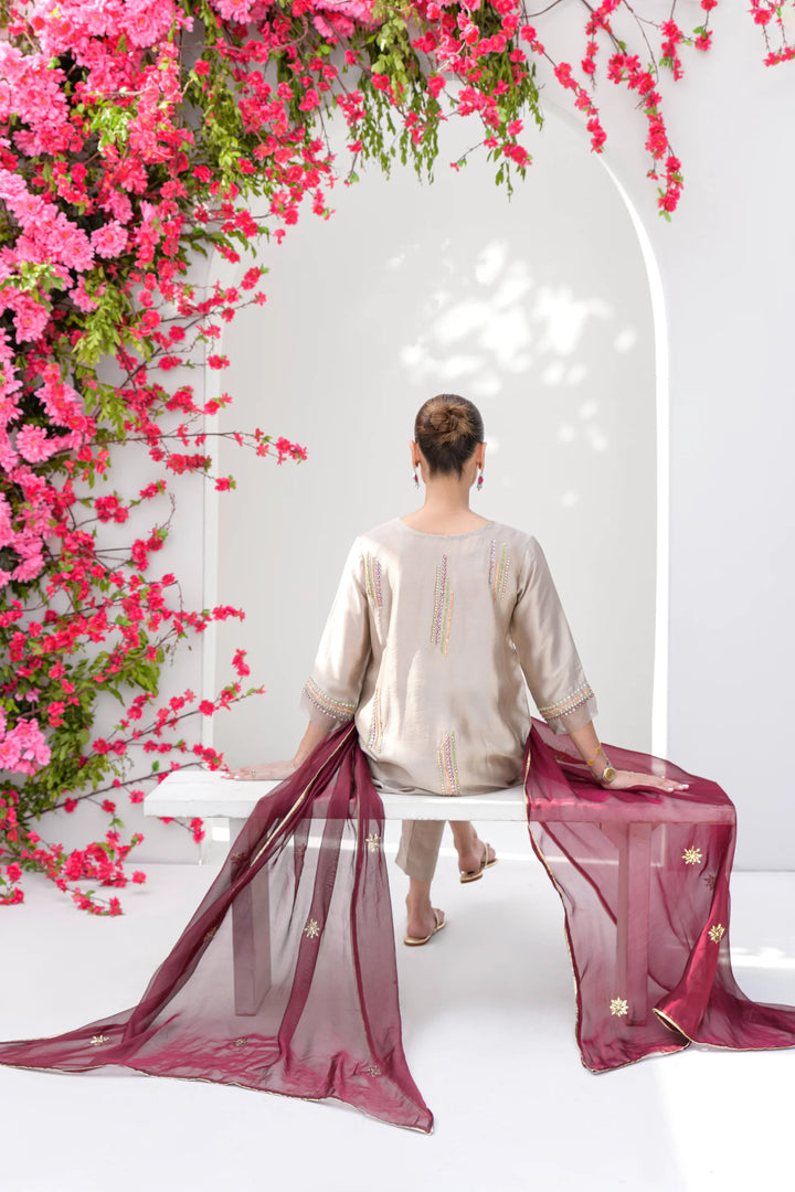 An elegant ivory short shirt paired with a sleek shalwar, both tailored from pure Sheesha silk and perfectly complemented by a rich maroon Kamdani dupatta in pure Sheesha organza. The shirt features intricate embroidery with Kamdani, sequins, Kora, and Resham work—blending subtle shimmer with timeless grace. A refined and graceful choice for summer sophistication.