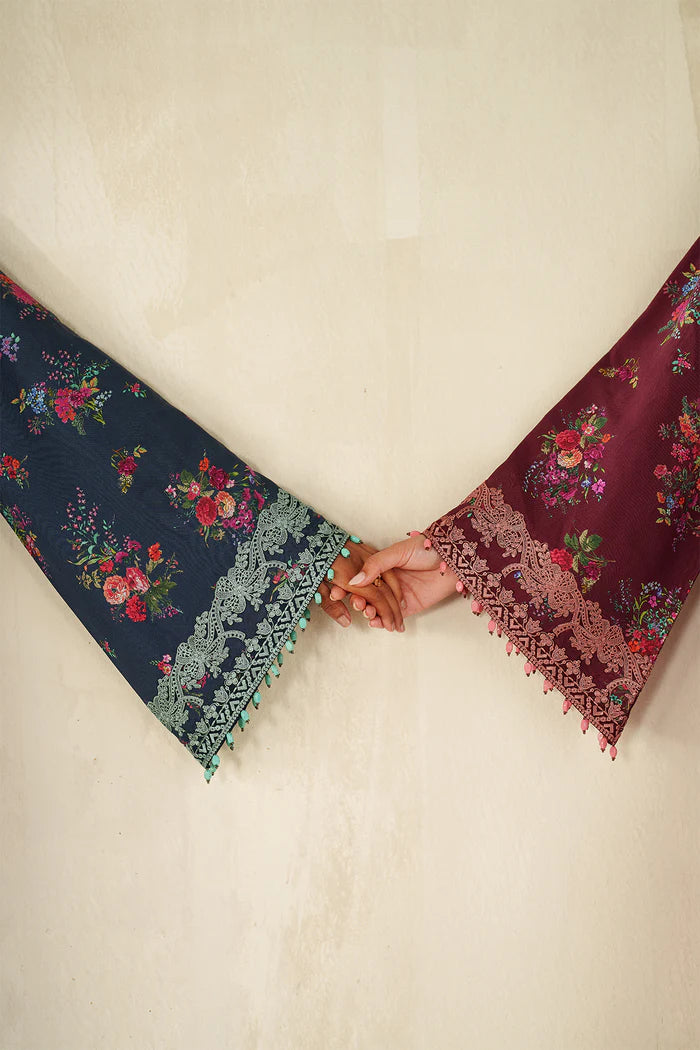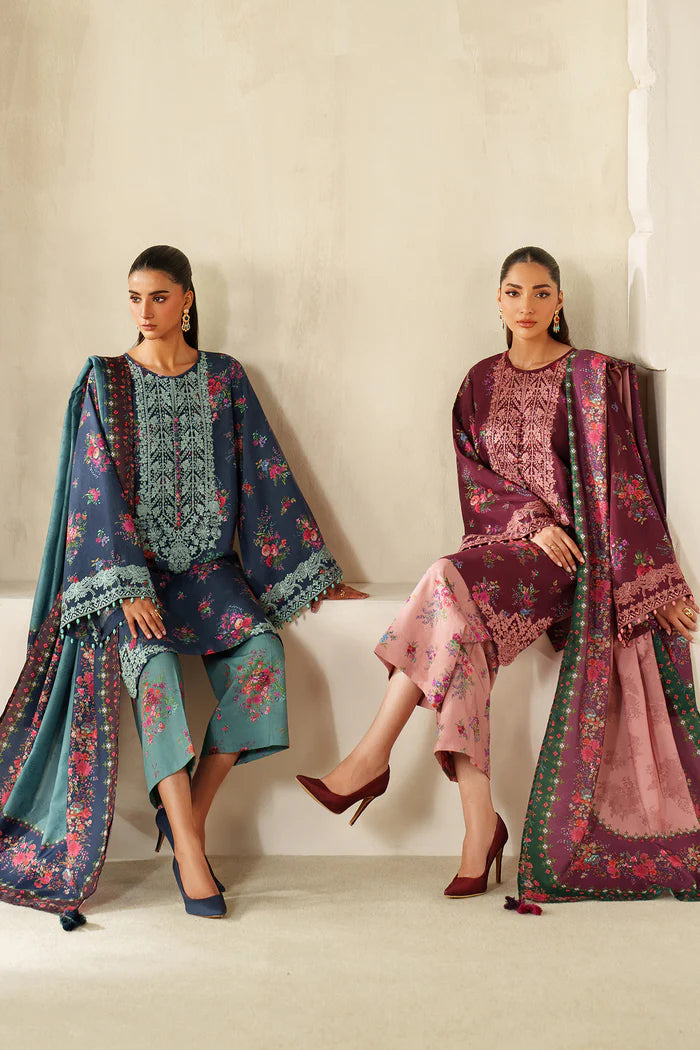 Elevate your wardrobe with this stunning three-piece ensemble featuring a digitally printed slub khaddar shirt and trouser set. The delicate embroidered organza neckline patch and intricately detailed sleeve borders add an elegant touch of sophistication. Paired with a beautifully printed pashmina shawl, this collection brings together comfort and style for any occasion. Perfect for those who appreciate quality craftsmanship and timeless design.