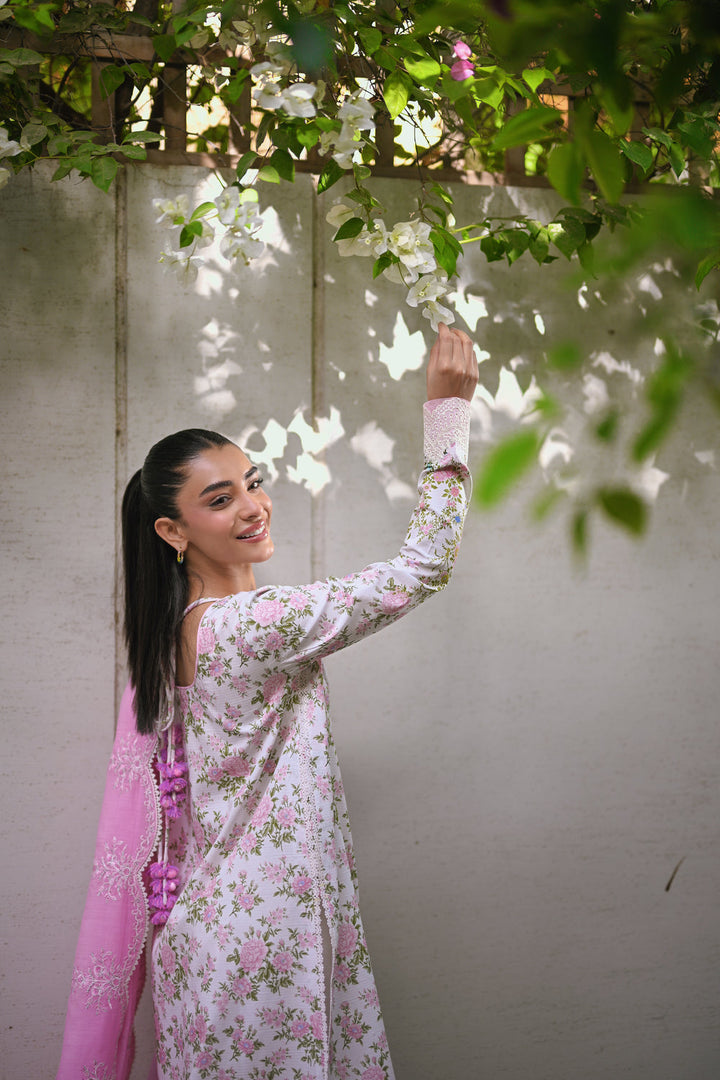 Elevate your style with our exquisite printed embroidered floral shirt, featuring a stunning teasel embroidered neckline and delicate embroidery on the sleeves and hem, enhanced with elegant organza details. The look is completed with a beautifully scalloped trouser and a contrasting blush pink dupatta, adorned with four-sided heavy scalloped lace, adding a touch of timeless grace to your ensemble. Perfect for any occasion where sophistication is a must.