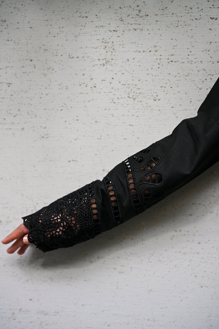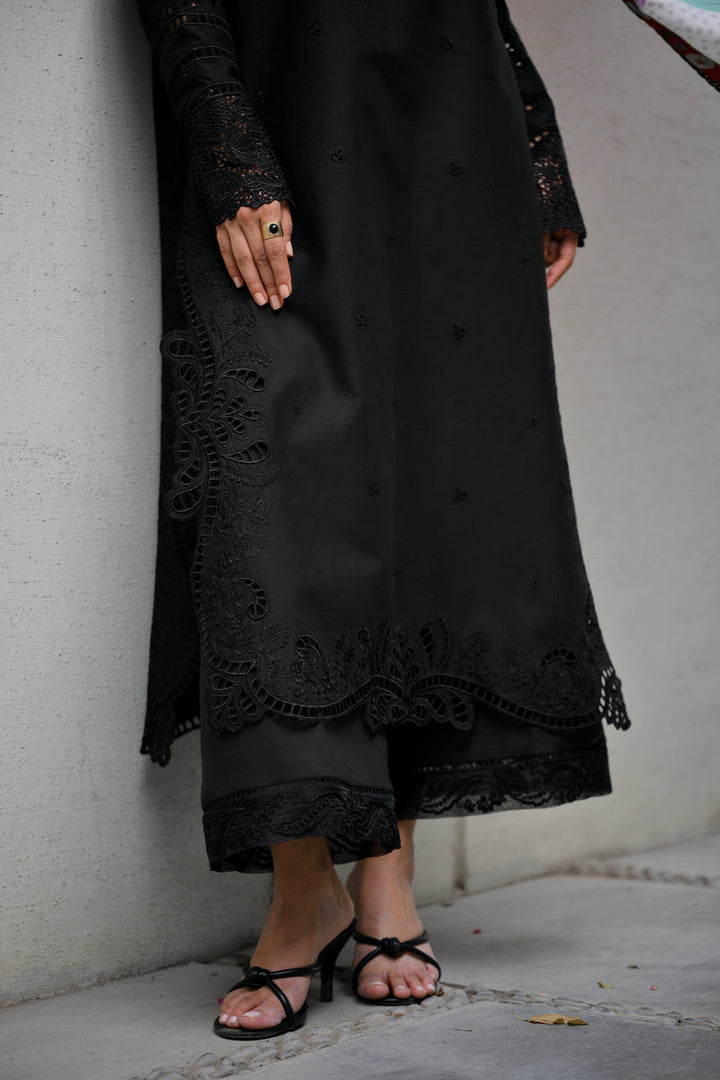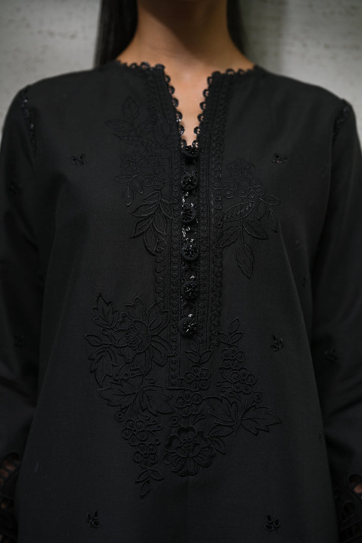 Exude sophisticated style in this striking black ensemble, showcasing intricate Schiffli embroidery throughout the long shirt. A refined scalloped border adds a touch of classic elegance, while a unique boaring patch on the sleeves offers a contemporary detail. The neckline features eyecatching buttons, serving as a focal point of the design. Paired with comfortable and stylish izaar pants, the outfit is beautifully complemented by a colourful printed silk dupatta. Delicate lace detailing on both the neckline and sleeves provides a polished and elegant finish.