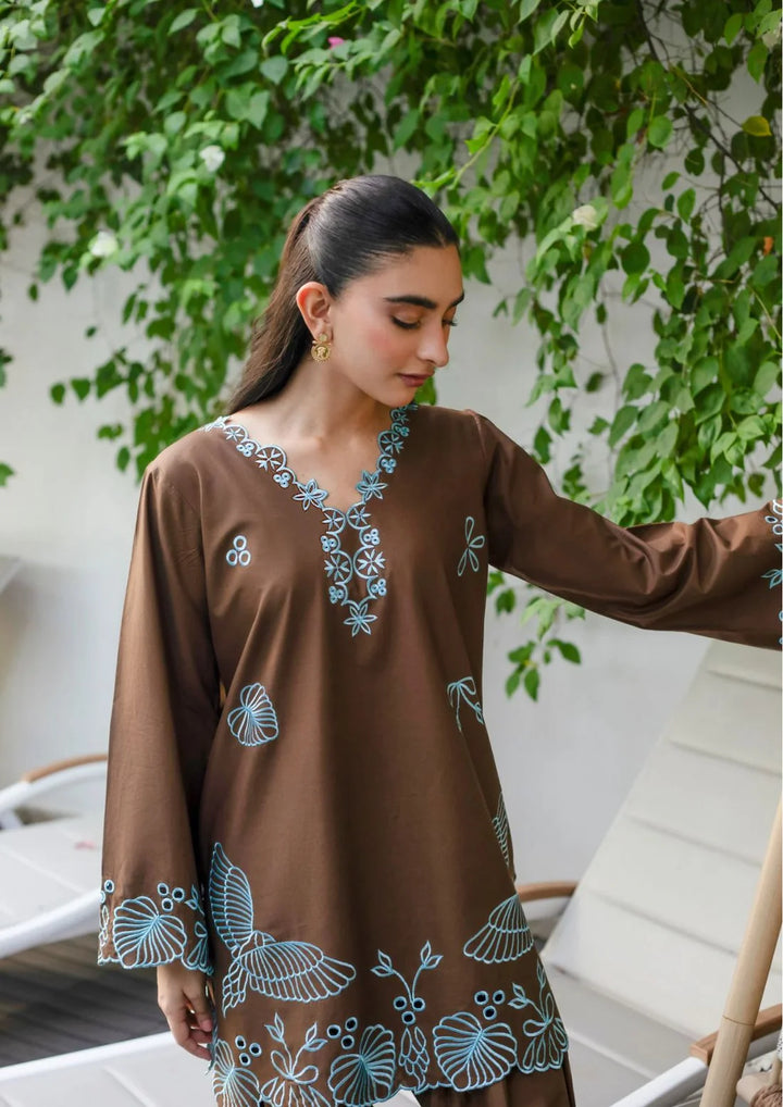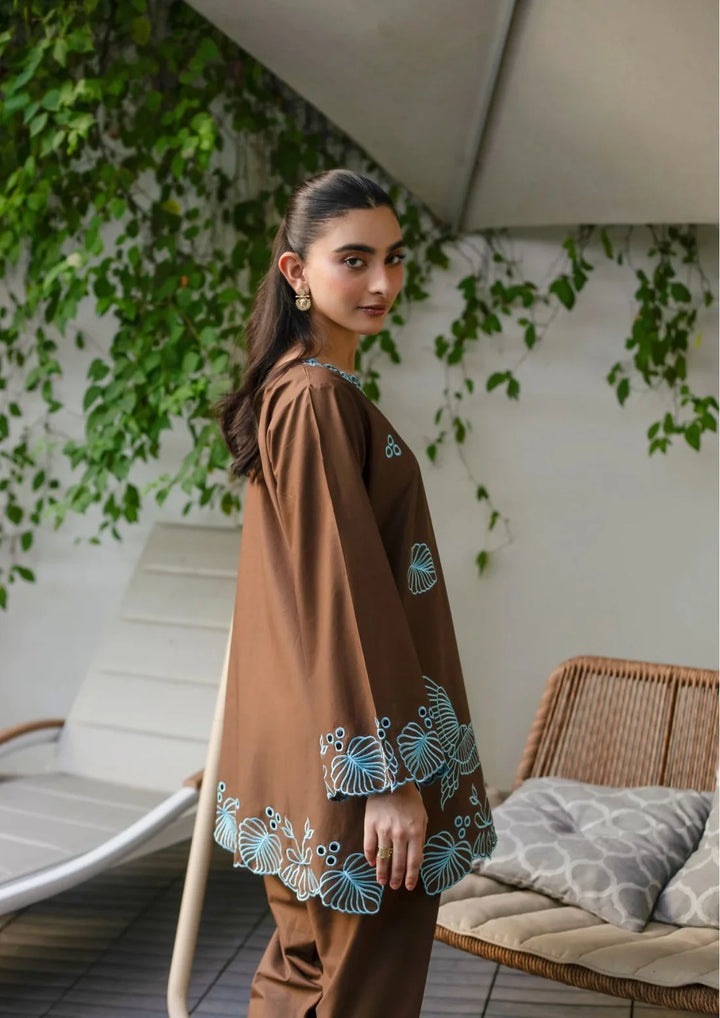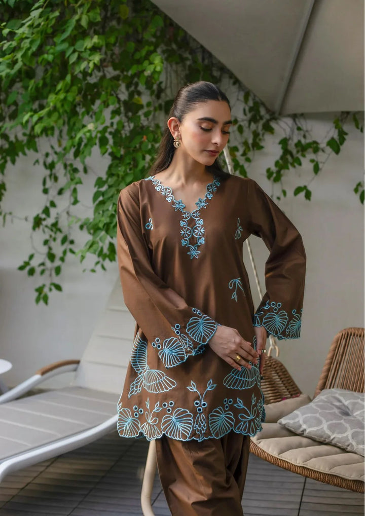 Perfect Brown with trendy light blue thread embroidery, where soft warmth meets cool tones like dusk.