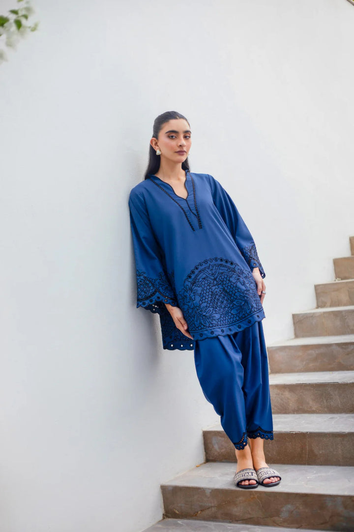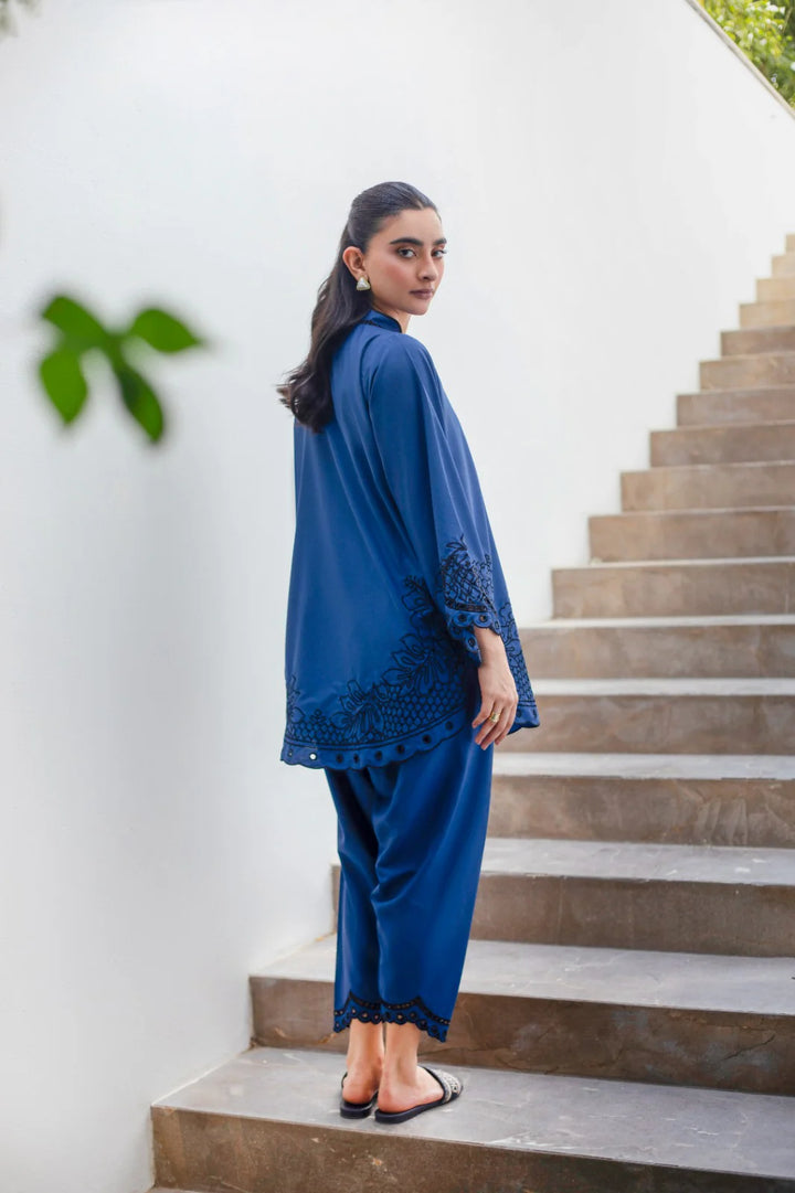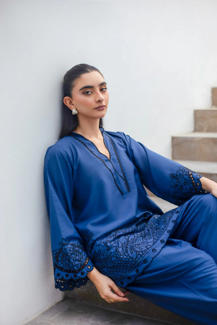 Royal bright blue with black embroidery — deep,tonal, mysterious.