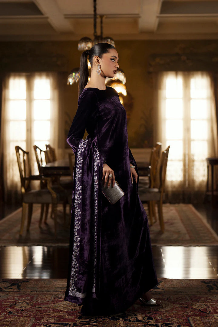 - This deep purple velvet dress makes a modern statement with crystal embellished draped sleeves. Pair with "Areem Stole" to complete the look.