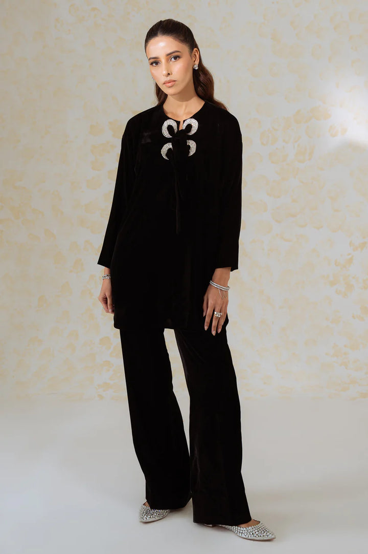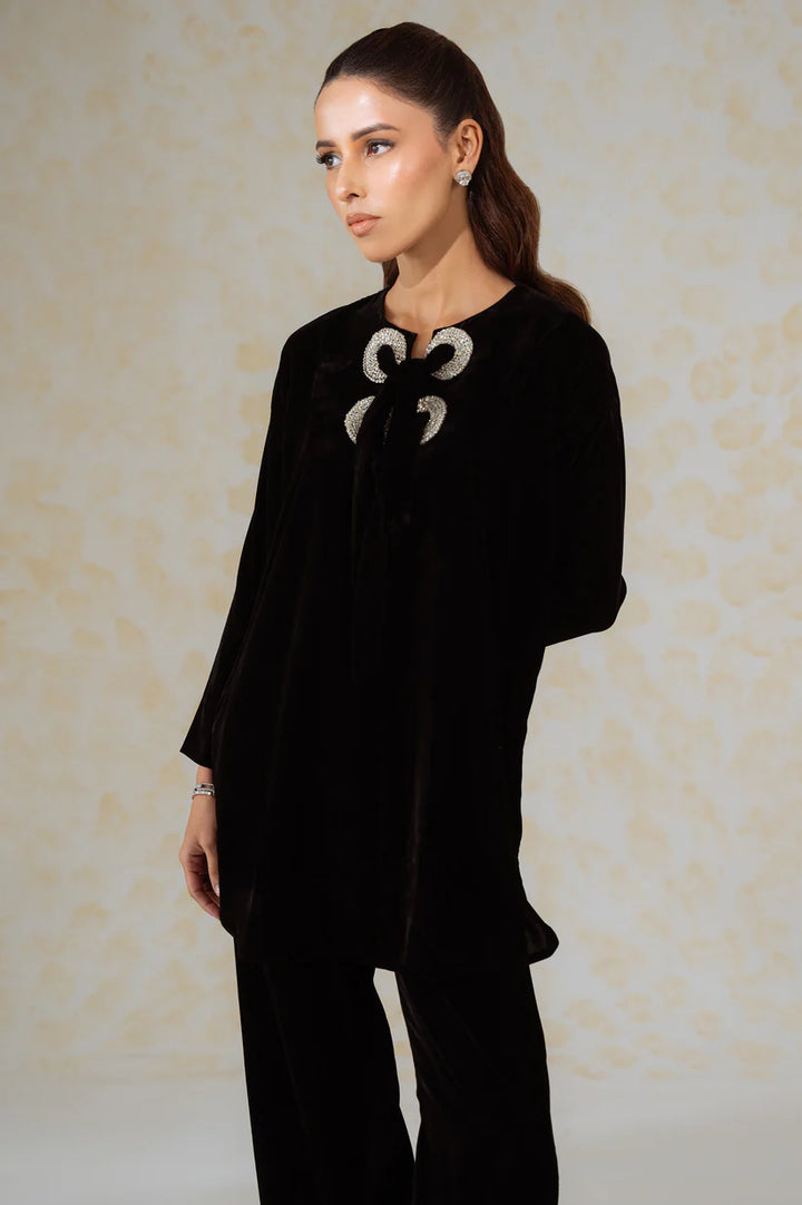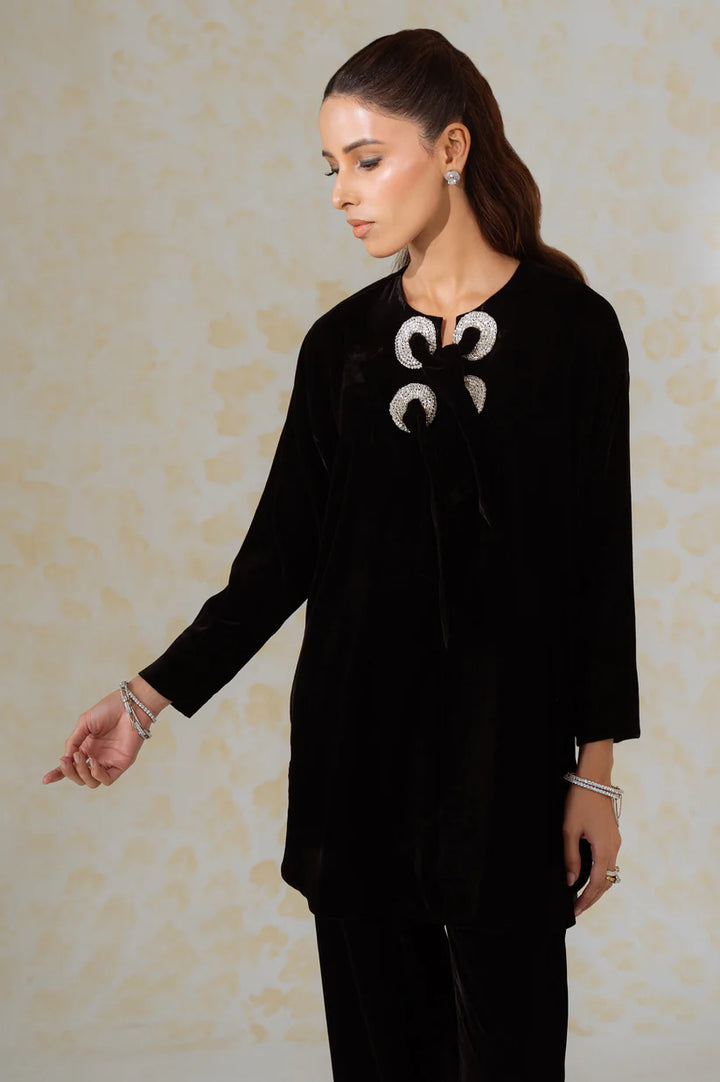 A jet-black two-piece ensemble crafted from luxe velvet, featuring a straight-cut kurta adorned with exquisite hand embroidery. The intricate design showcases delicate Saroski stones and kat dana detailing that adds a subtle shimmer to the rich fabric. Paired with wide-leg velvet trousers, this ensemble exudes refined elegance and timeless sophistication, perfect for evening soirées and festive gatherings.