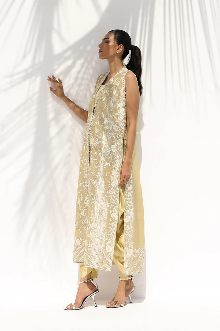 This radiant creation in soft butter yellow exudes timeless elegance, with intricate floral embroidery that dances across the fabric in delicate swirls of ivory and silver. The long, open-front silhouette is accentuated with exquisite detailing along the hem and front placket, striking a perfect balance between understated opulence and modern allure. A sleek charmeuse tube top and draped shalwar complete the look, complementing the jacket’s luminous texture with graceful ease.
