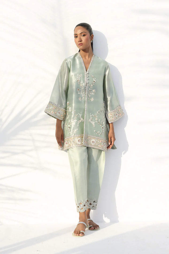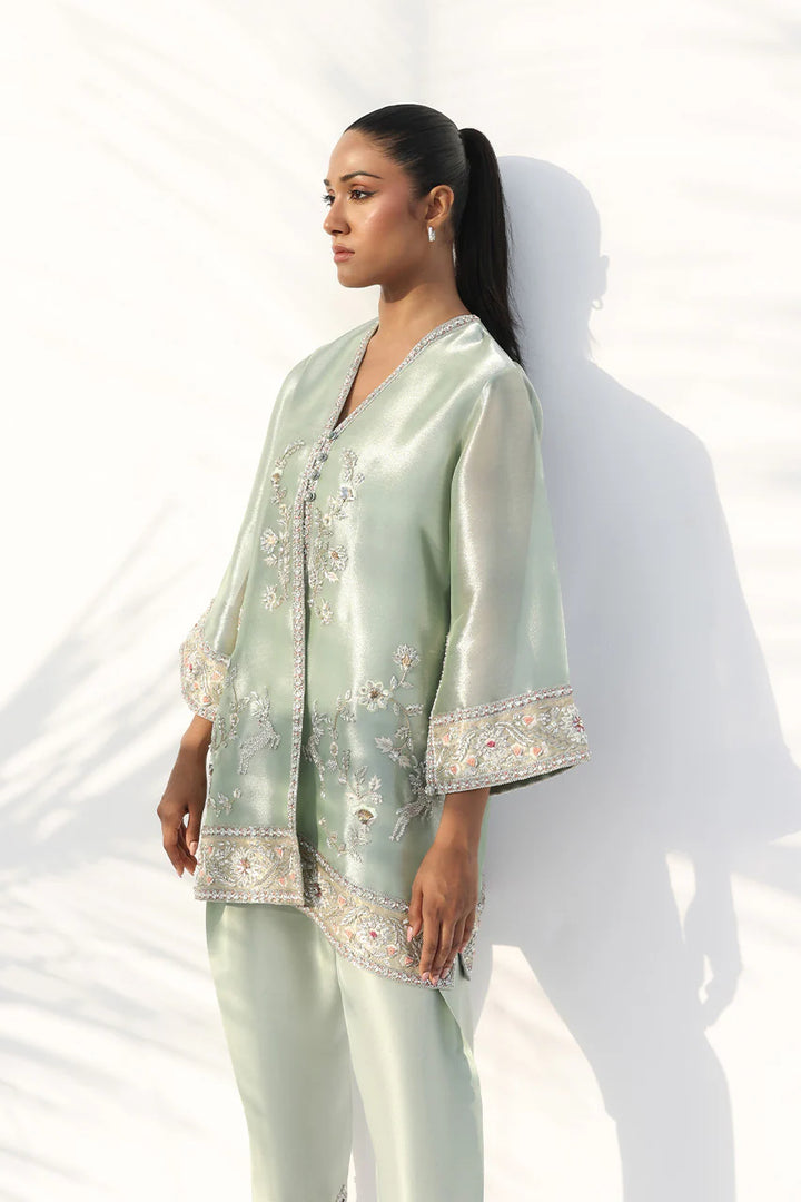 A serene aquamarine ensemble featuring a front open tissue kurta adorned with intricate zardoze embroidery in silver thread, pearls, and sequins that shimmer softly along the neckline, sleeves, and borders. The wide cuffs are richly embellished with appliqué and ornate detailing, adding a festive allure. Paired with a matching pure Raw Silk tube top and tapered shalwar finished with embroidered cutwork hems, the look exudes effortless grace and refined elegance.