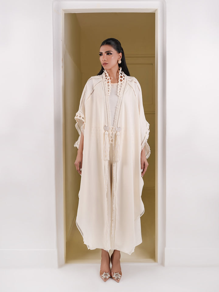 - Ladder lace ivory cape with elaborate hand made tassels, laces and hand-sewn pearls