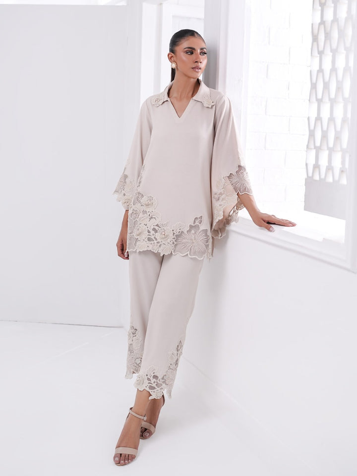 - Elaborate 3d beaded cut work lace with net on shirt, sleeves and culottes