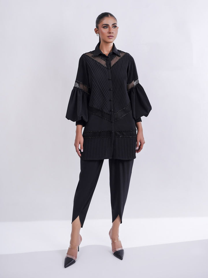 - Pleated shirt with beaded lace appliqué on net trims all over