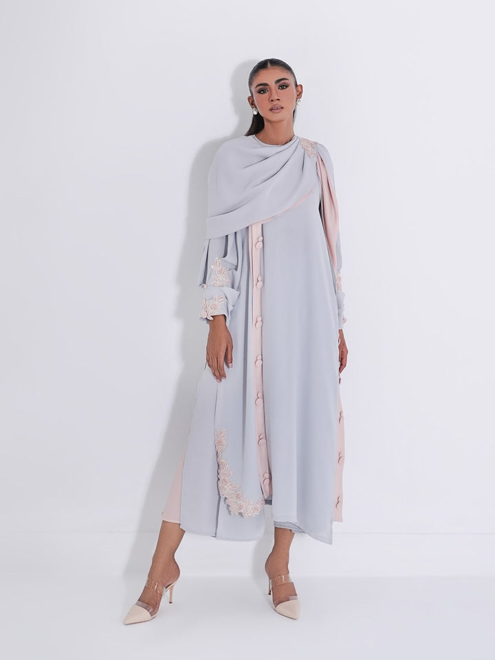 - High-low shirt has 40 hand-sewn buttons in different sizes
