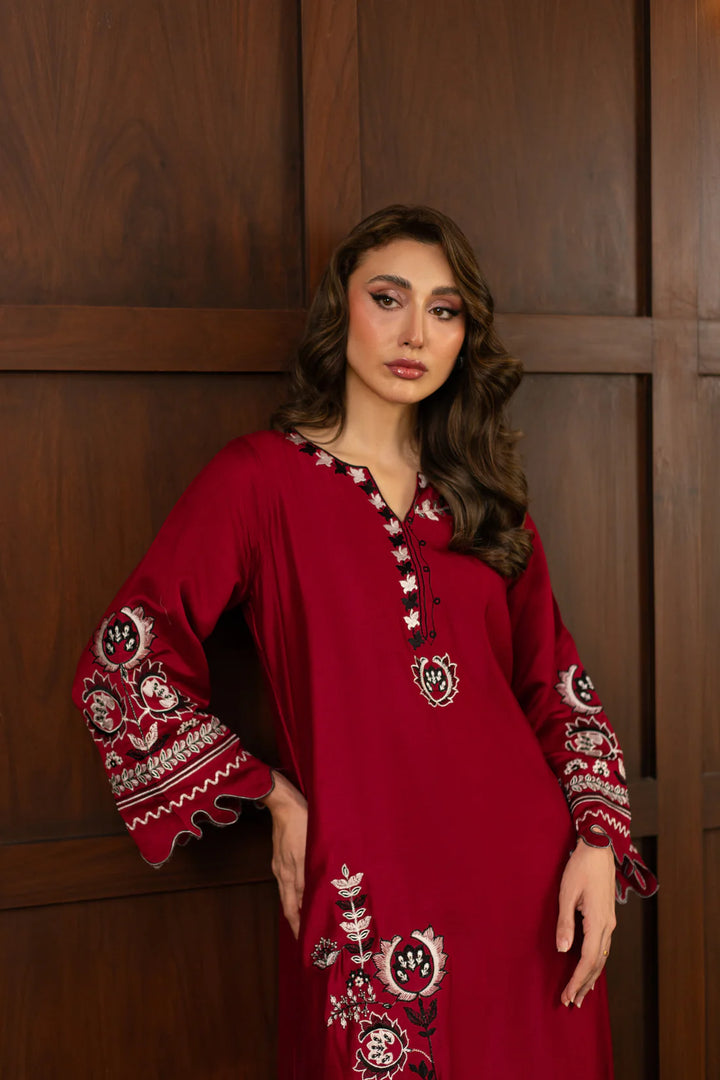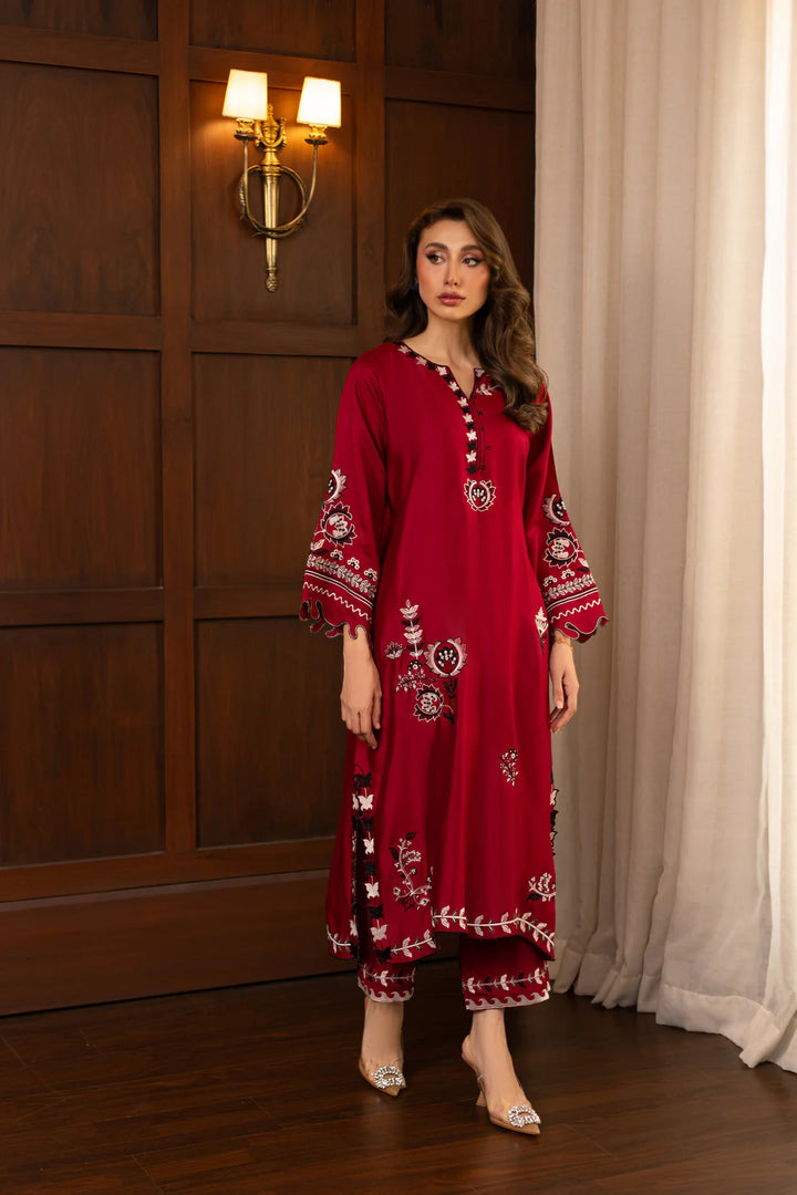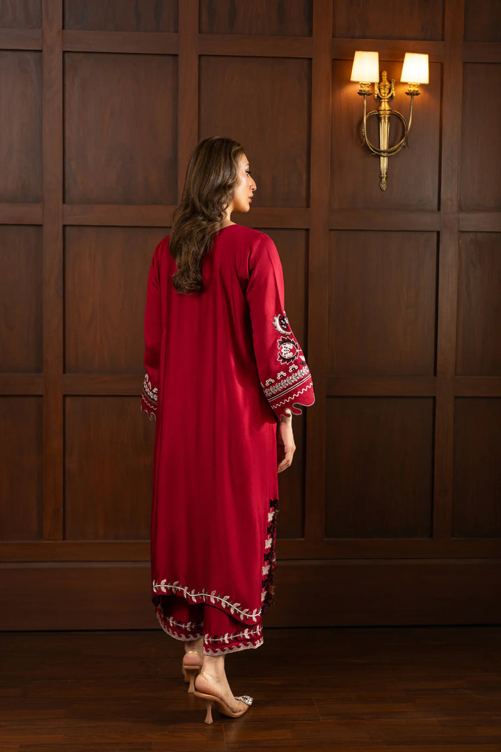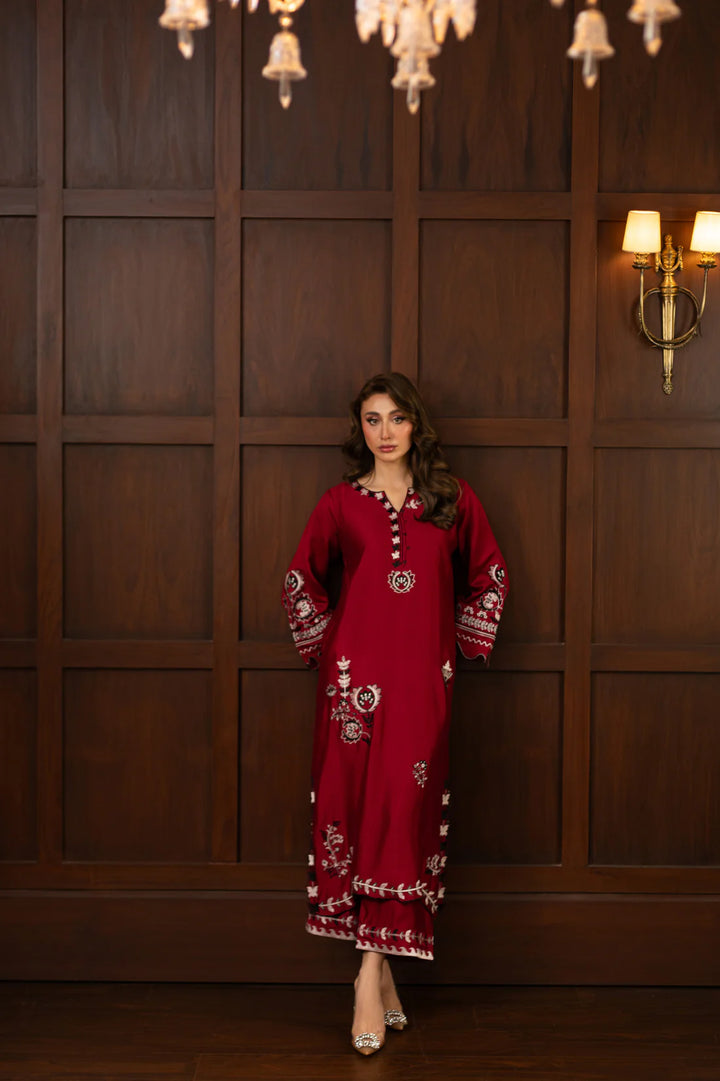 Draped in the richness of maroon Khaadi silk, ‘Merlot Maroon’ embodies festive luxury with a bold, timeless edge perfect for evening Eid soirées!