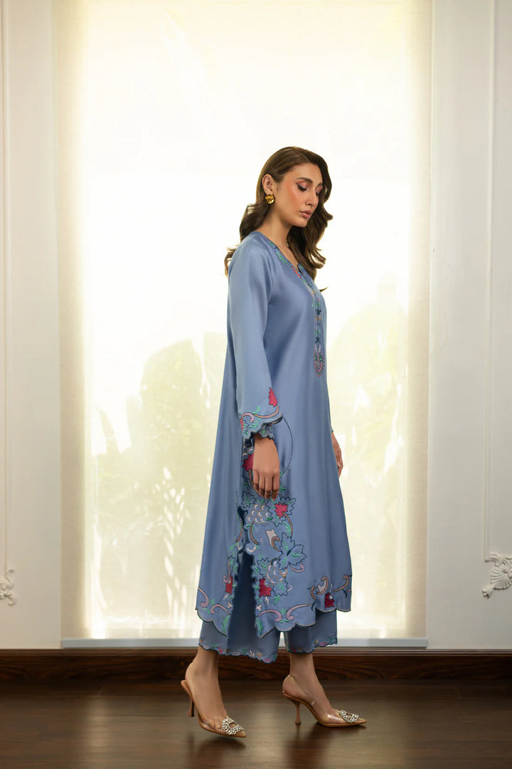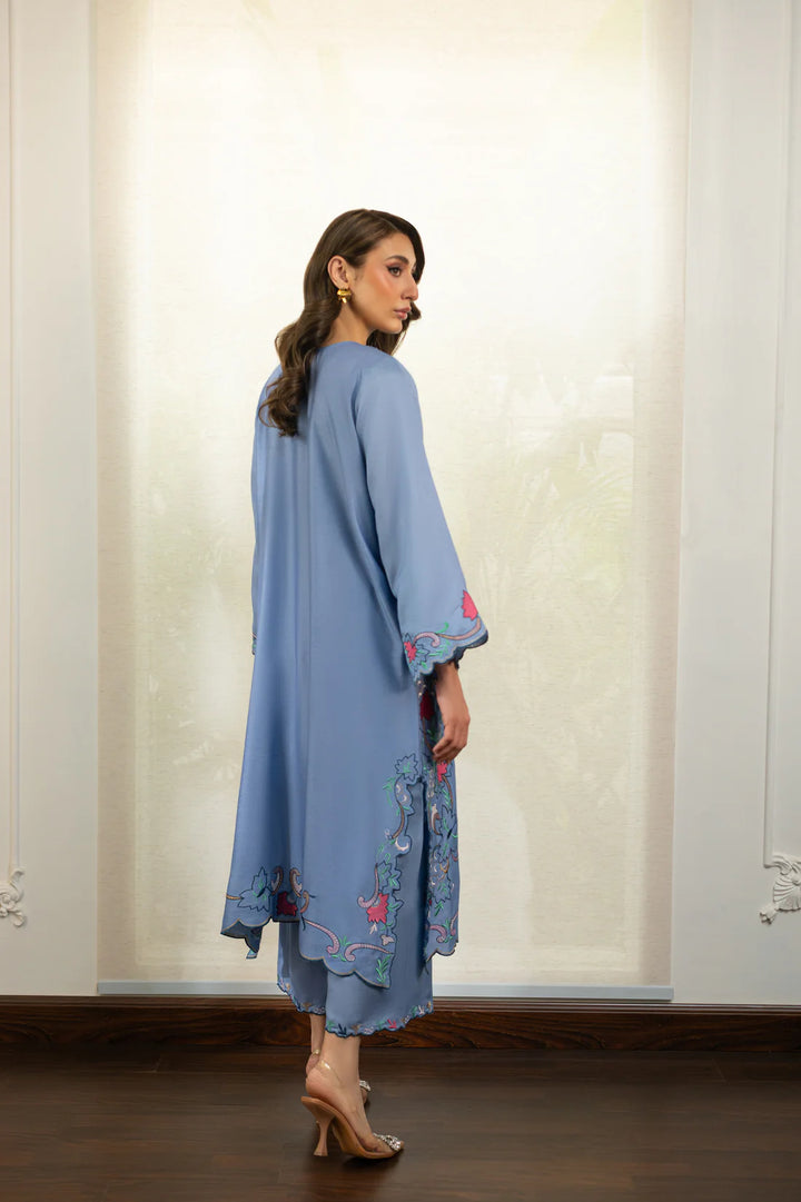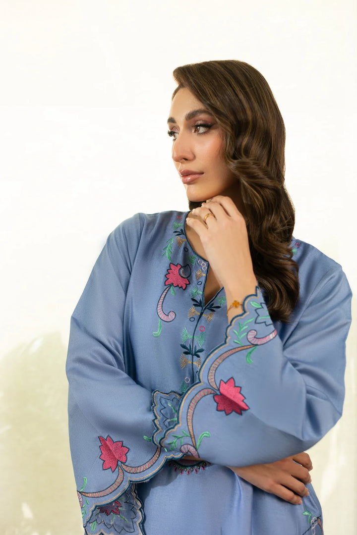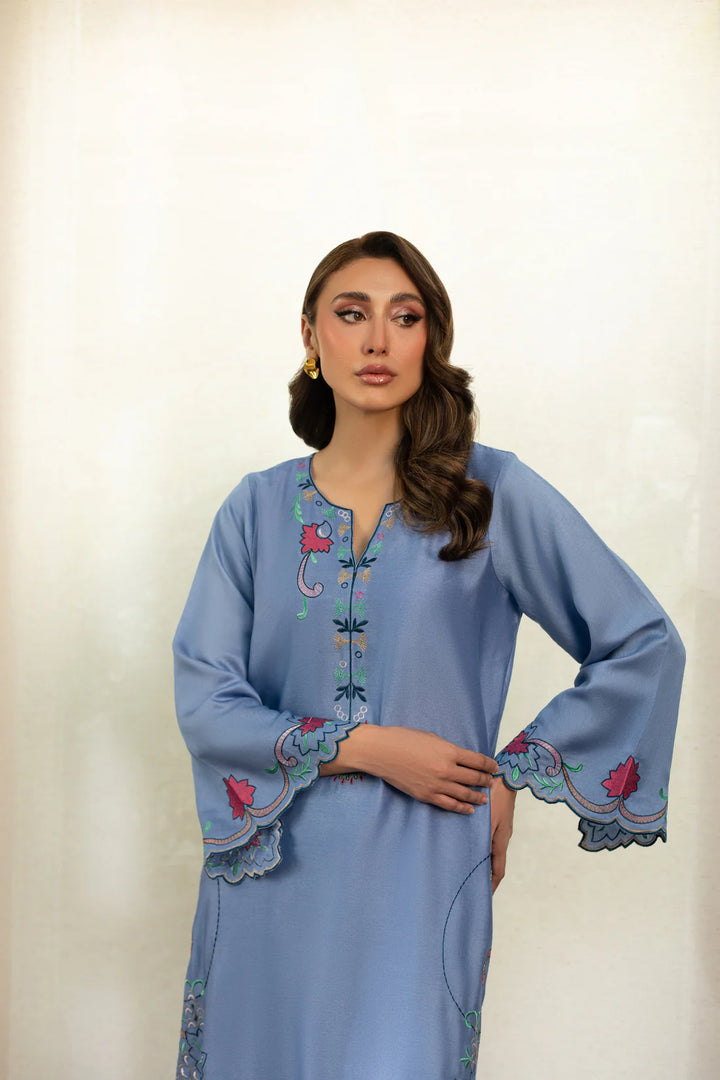 Embrace the eid glow in our ethereal pastel blue khaadi silk ensemble, with delicate details and dreamy hues , it's perfect for a day of celebration.