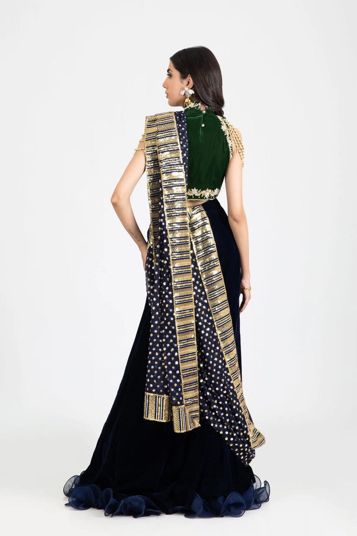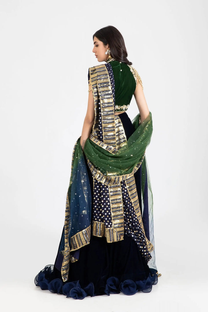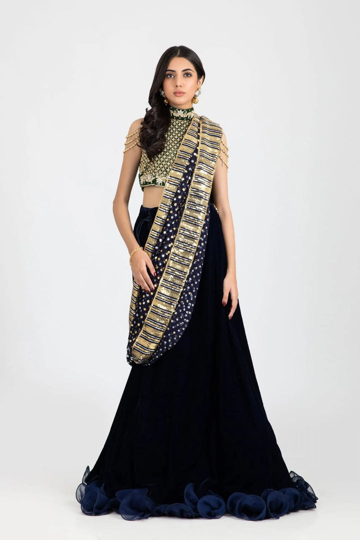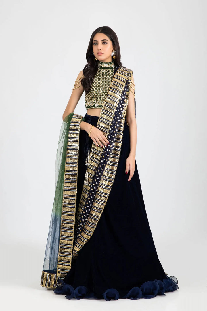 Float your way this wedding season in pure elegance with our olive green and blue lehenga set. Rich olive-green velvet halter blouse with high neck is rendered in glowing gold and silver crystals, gotta, dabka and pearl touches, with unique hand embellishments dangling on biceps. Layers of chiffon ruffles and intricate hand worked tassels on waist accentuate this dreamy midnight blue lehenga. Drape it with kaamdani clad chuniri dupatta or shaded net dupatta adorned with sequin chann and borders for an effortless high-end formal look.