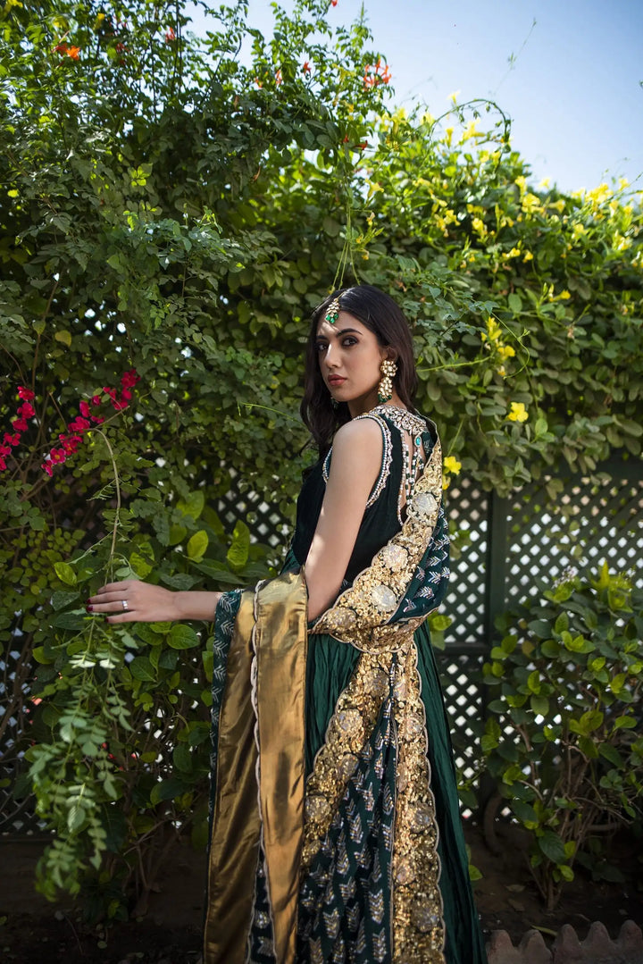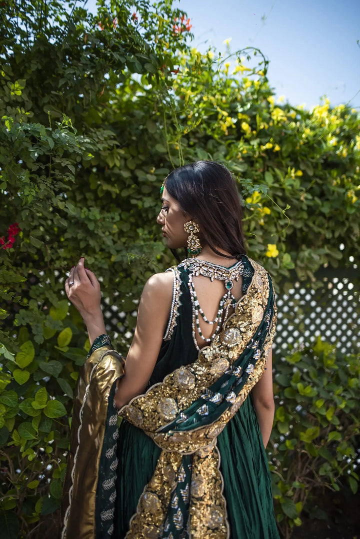 This ensemble is all about taking the glam route with modern shimmer and sparkle. Yards of emerald tissue silk sits on a bronze crushed silk lehenga, with gold borders stitched to perfection. Velvet bodice is intricately embellished with crystal, Pearl and emerald stones to add grandeur in this modern silhouette. Comes with crushed silk dupatta but you can opt for this gorgeous chiffon dupatta slathered in sequin work with heavy embellished gold border.