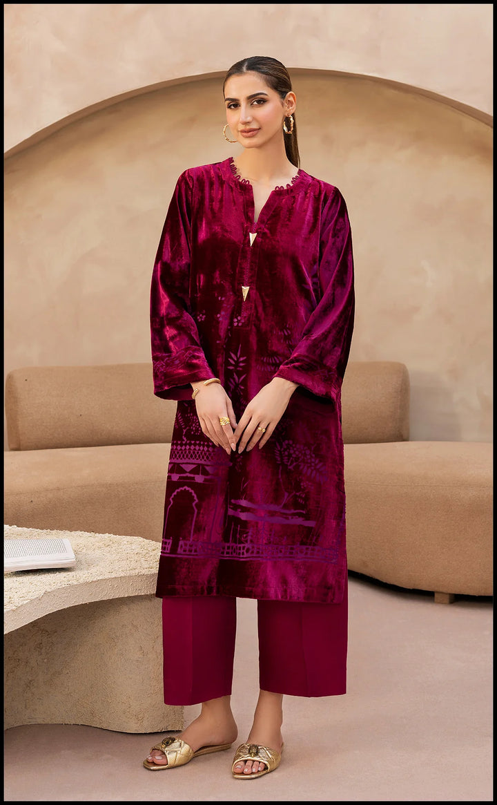 Radiate confidence and charisma with Crimson Rose — a statement velvet co-ord set that embodies opulence in its purest form. The rich maroon hue, reminiscent of royal grandeur, is elevated by the soft sheen of plush velvet and intricate embossed detailing that catches the light with every movement.