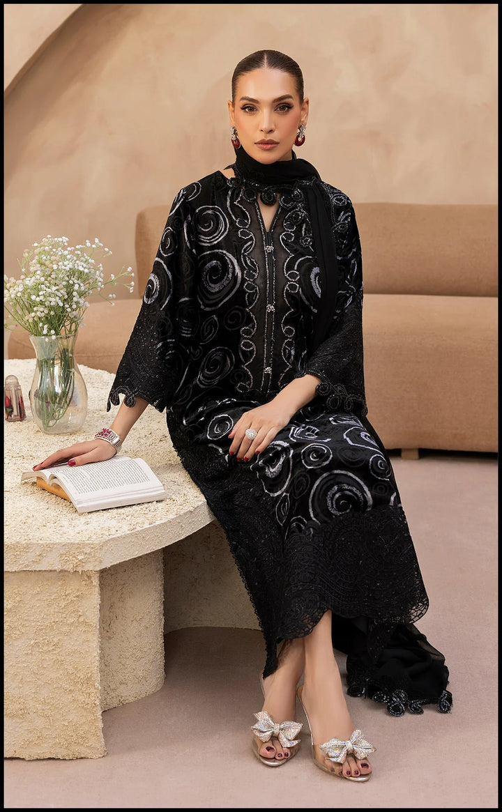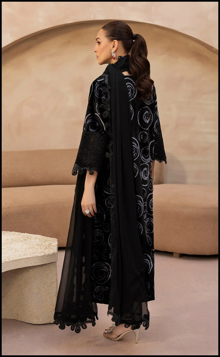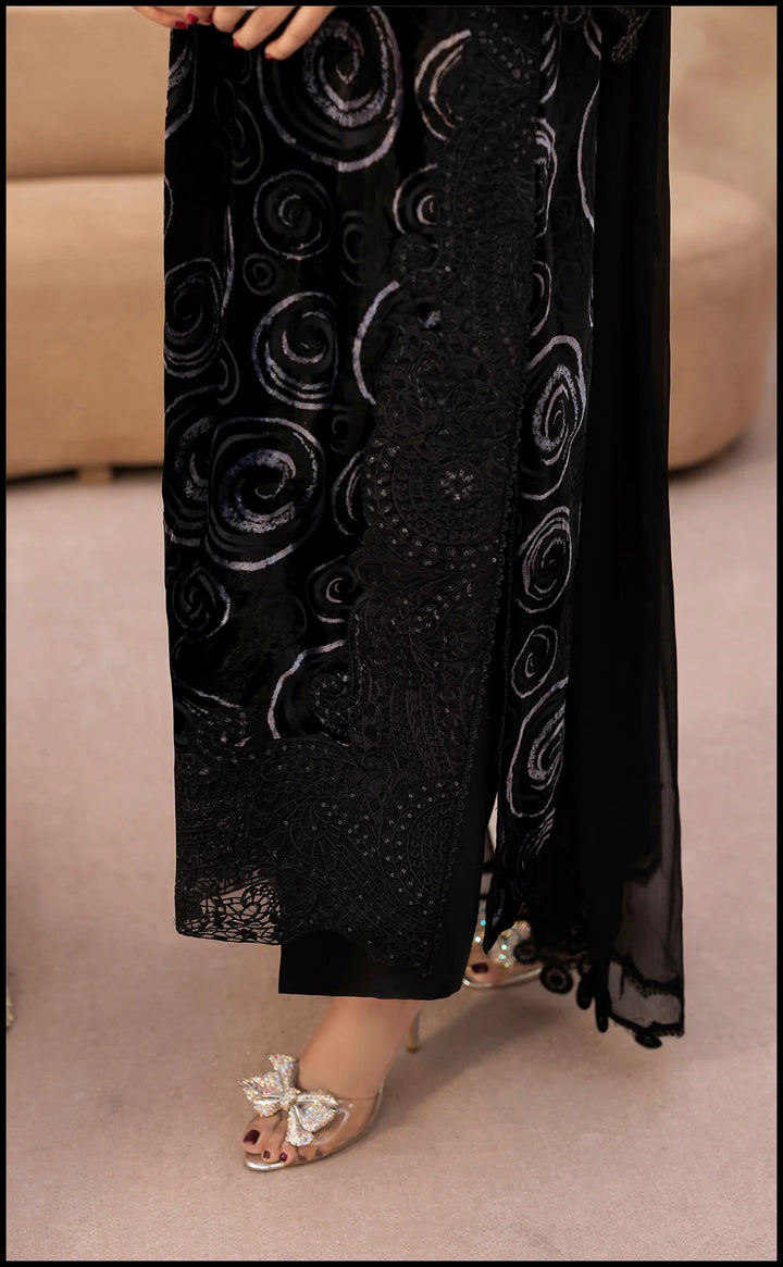 Enigmatic and effortlessly refined, Midnight Mystique is a 3-piece velvet ensemble that captures the allure of timeless black. The shirt features intricate embroidered swirls that shimmer with subtle elegance, while the delicately finished sleeves and hem exude sophistication. Paired with coordinated trousers and a soft, flowy dupatta, this look strikes the perfect balance between grace and grandeur — making it an exquisite choice for evening gatherings and winter festivities.