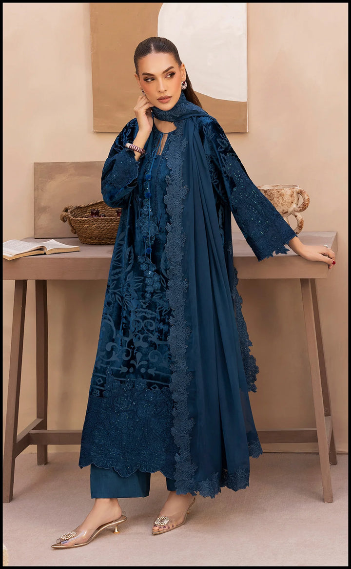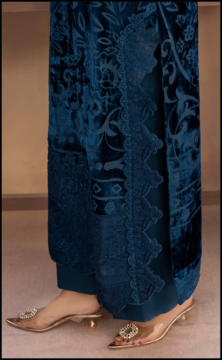 Immerse yourself in the elegance of Teal Temptation — a three-piece embroidered velvet ensemble that blends regal charm with contemporary grace. The shirt is exquisitely detailed with intricate tonal embroidery, accentuating the neckline, sleeves, and hem with finesse. Paired with matching trousers and a delicately embellished dupatta featuring ornate borders, this ensemble captures the essence of winter luxury.