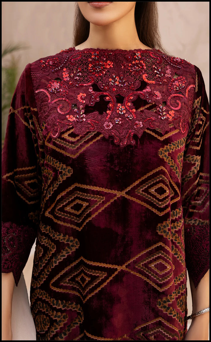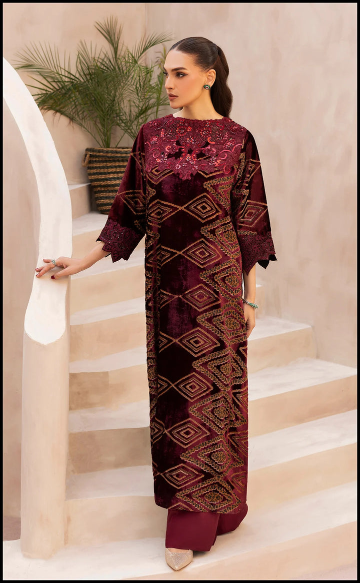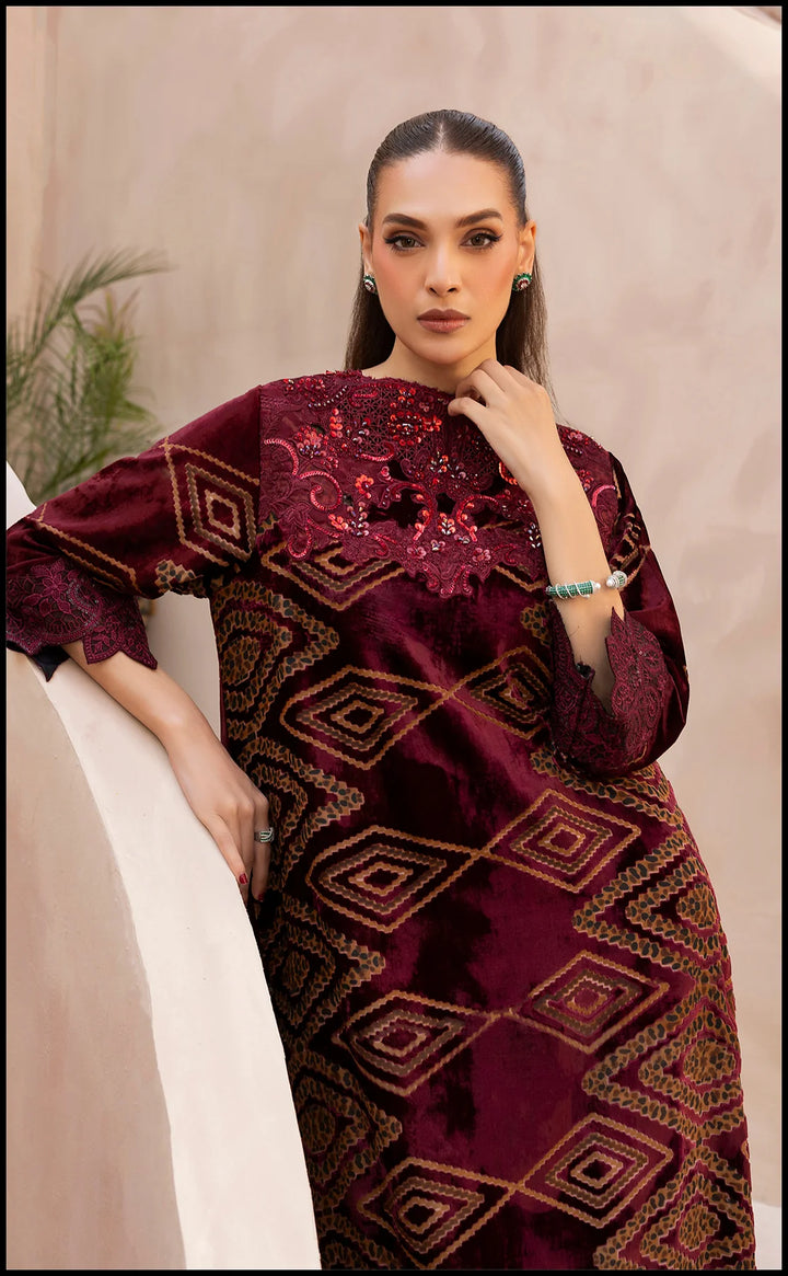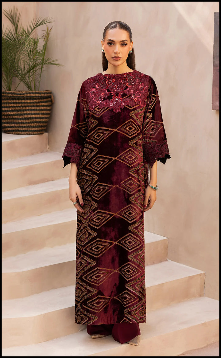 Wrapped in opulence, Wine Spell is a two-piece velvet kaftan ensemble that embodies understated grandeur. The deep wine hue exudes regal warmth, while delicate embroidery along the neckline and sleeves adds a touch of golden enchantment. Crafted from plush velvet that drapes effortlessly, this ensemble captures the magic of timeless elegance — a spellbinding blend of luxury and grace, perfect for evening soirées and winter festivities.