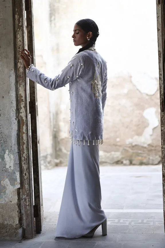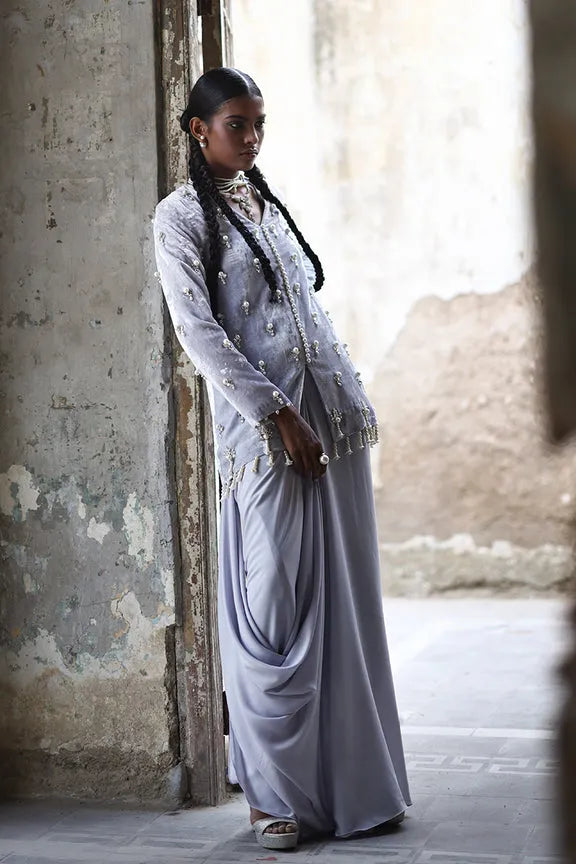 A vision of modern glamour, this short formal jacket style shirt in stunning silver Pure Velvet is hand-embellished with Swarovski crystals and delicate pearl work, featuring a statement back motif crafted in fine thread and pearls. Paired with our signature drape dhoti skirt, it strikes the perfect balance between artisanal craftsmanship and contemporary flair.