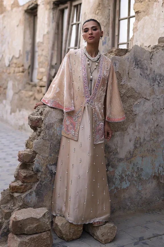 A true ode to craftsmanship and couture elegance, this formal kaftan, crafted from premium sheesha silk, is intricately hand-embroidered with lustrous pearls and Swarovski crystals, creating a soft, radiant shimmer.