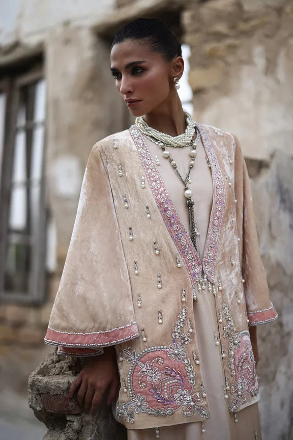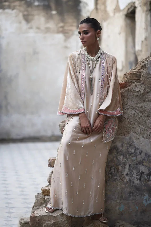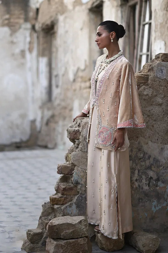 It is paired with a stunning pure velvet jacket in delicate rose nude hues, meticulously hand-embellished with zardozi, pearl, Swarovski, and appliqué detailing. The result is an ensemble that exudes timeless sophistication, blending artisanal mastery with contemporary grace, perfect for the woman who embodies effortless luxury.