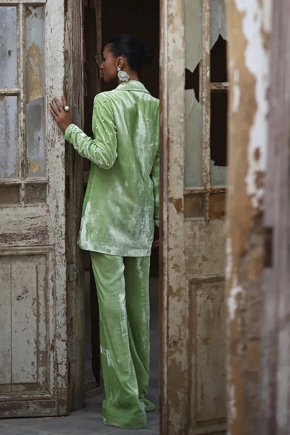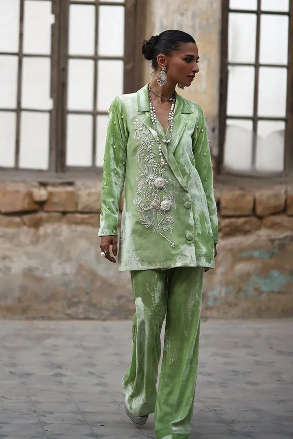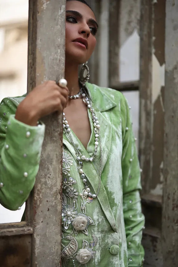 A statement in contemporary couture, this modern jacket, crafted in lush apple-green pure velvet, is meticulously hand-embroidered with pearls, zardozi, sequins, and Swarovski crystals, adorned with handcrafted organza flowers for a touch of artistic romance.