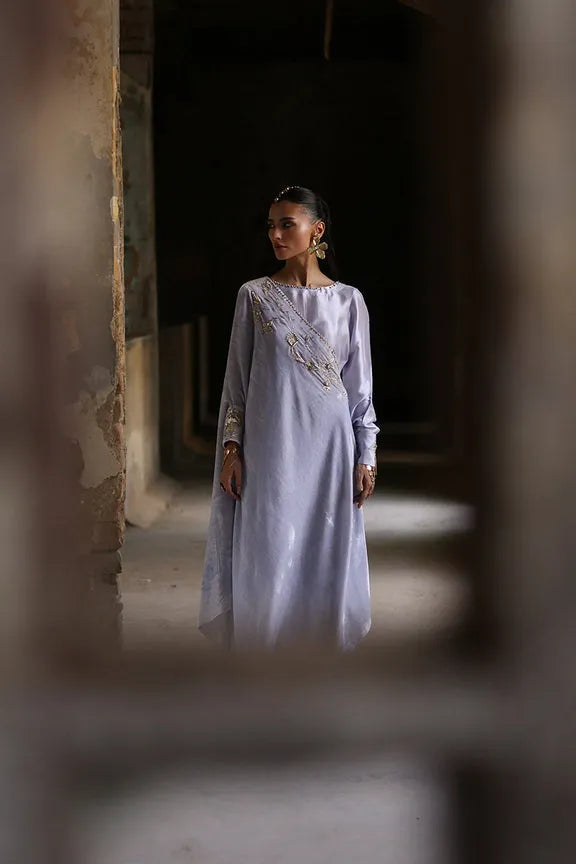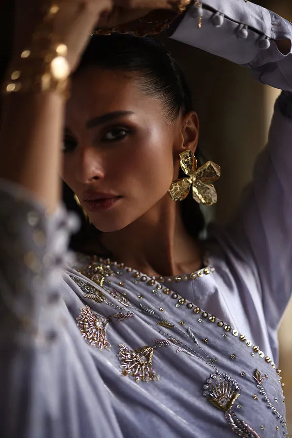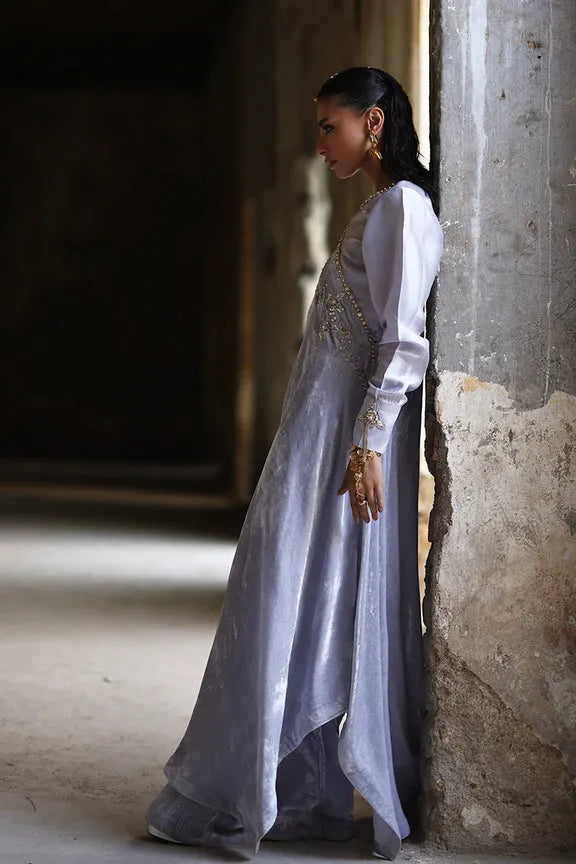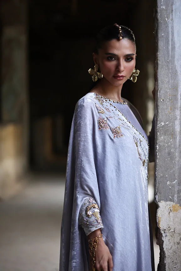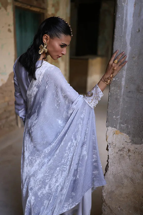 Our iconic signature cross-body drape returns and reimagined in two-tone pure velvet with a stunning silver hue that radiates modern opulence. Each piece is intricately hand-embroidered with formal zardozi detailing, lavishly embellished with sequins and crystals, reflecting exceptional artistry and precision.