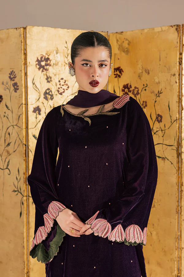 Embroidered and hand embellished velvet long shirt paired with tie and dye chiffon dupatta and raw silk trouser.