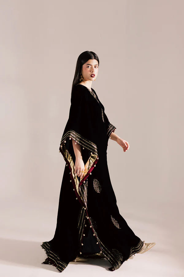 A luxurious black embroidered velvet kaftan paired with raw silk pants
