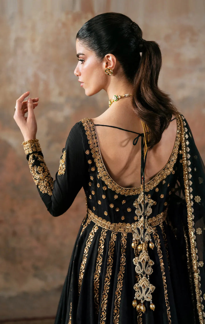 This black pishwas with gold accents is a stunning blend of boldness and sophistication. This silk pishwas with heavy borders and hand embellished bodice paired with heavily hand embellished sleeves using dabka nakshi and kora. A silhouette that blends traditional Mughal grandeur with modern craftsmanship. Paired with an ordanza dupatta, celestial-inspired piece that blends delicate craftsmanship with whimsical charm. It's perfect for mehndi, sangeet, receptions, or even as part of a bridal look for someone seeking an ethereal, romantic aesthetic.