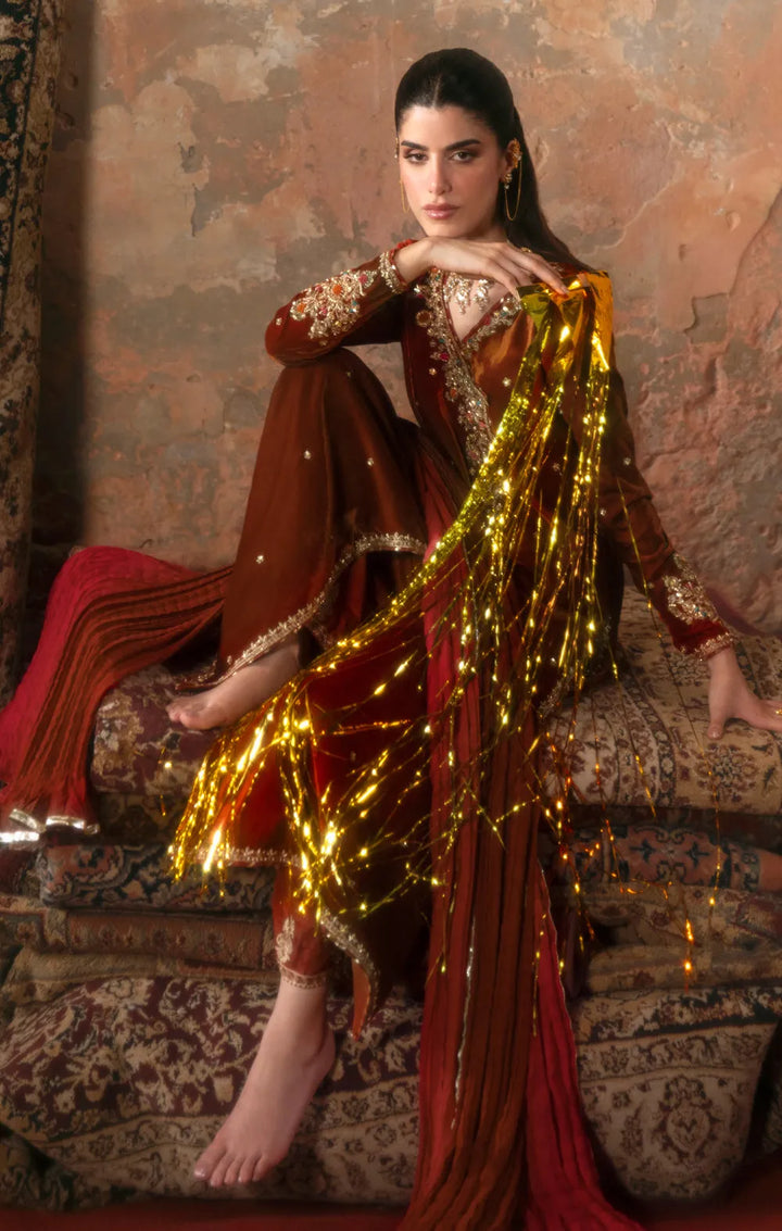 Promising burnt orange elegance, NAME is an enchanting harmony of time-honored crafts composed on a sumptuous, burnt orange velvet canvas. The angrakha style shirt showcases a delicately hand embellished bouquet pattern will dabka tilla and resham stitches. Each motif is further heightened by gota accents that bestow the ensemble with a majestic grace. Paired with a dazzling silk crushed two toned dupatta, comes with a embroidered culottes.