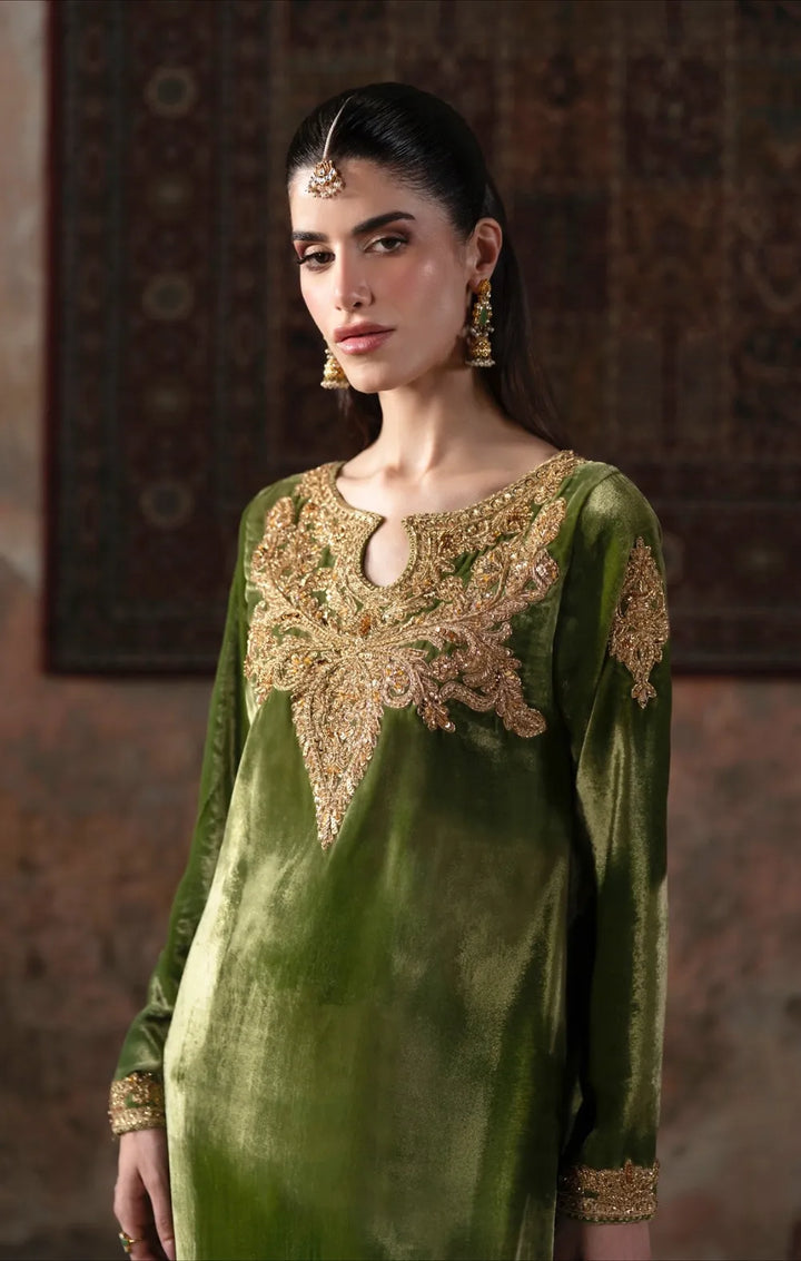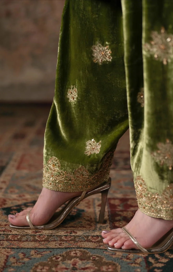 The pea green silhouette simply radiates eternal glamour. The neckline is adorned with exquisite handwork embellishments, featuring intricate gold tilla and dabka, along with sparkling sequins arranged in delicate floral motifs. This detail not only enhances the garment's regal appearance but also highlights the craftsmanship involved. The embellishment gracefully extends to the sleeves, creating a harmonious flow throughout the outfit. This ensemble is perfect for formal occasions, pair with a hand embellished motifs all over the velvet shalwar adds richness.