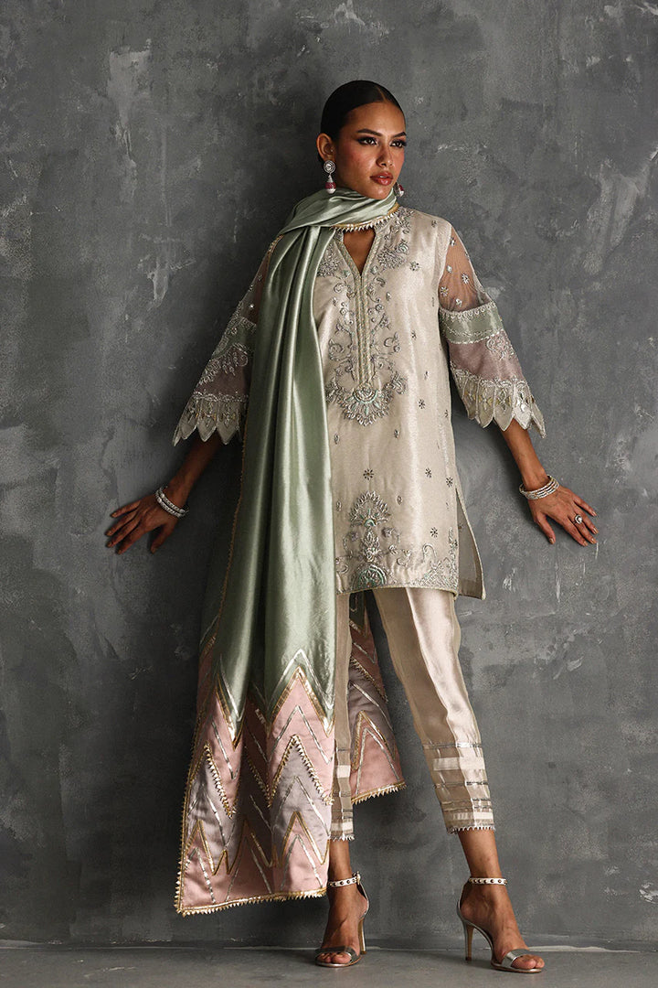 A relaxed lamay kurta in silver, 'Qamer' is brought to life with delicate zardozi, resham and gotta work, each stitch a nod to artisanal mastery. Statement applique sleeves are framed with gotta work lending a touch of a beautiful contrast. Paired with a tailored pure silk shalwar, its hem glistening with gotta details, the ensemble is anchored in quiet luxury. An ethereal silk dupatta appliqued with two-coloured scallops drapes the look in a whisper of vintage charm.