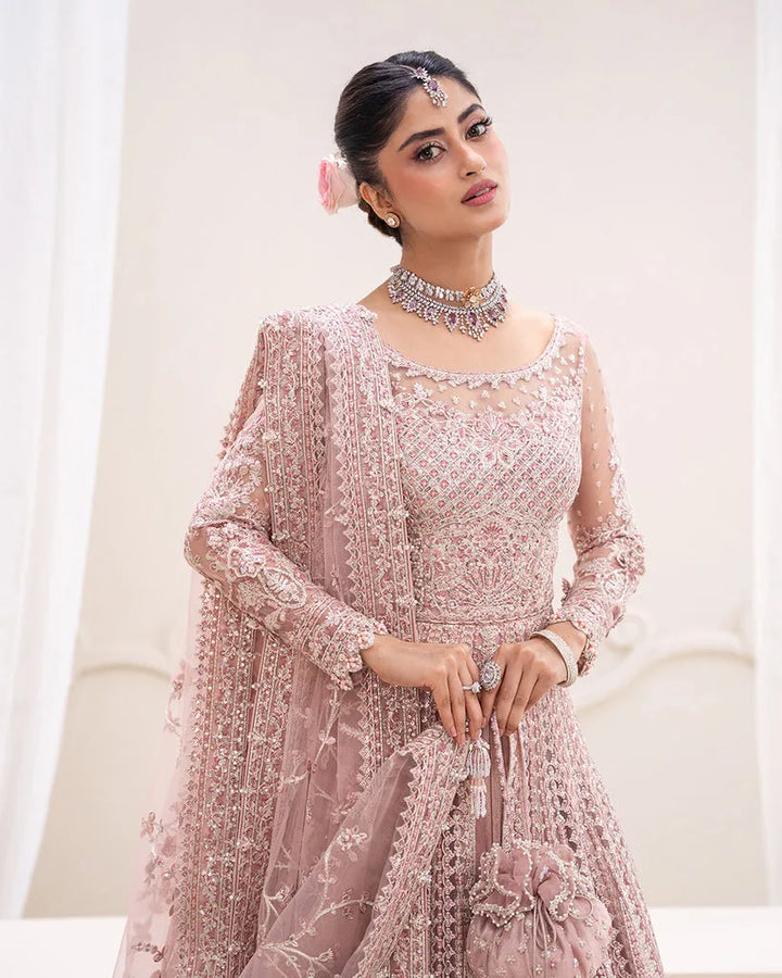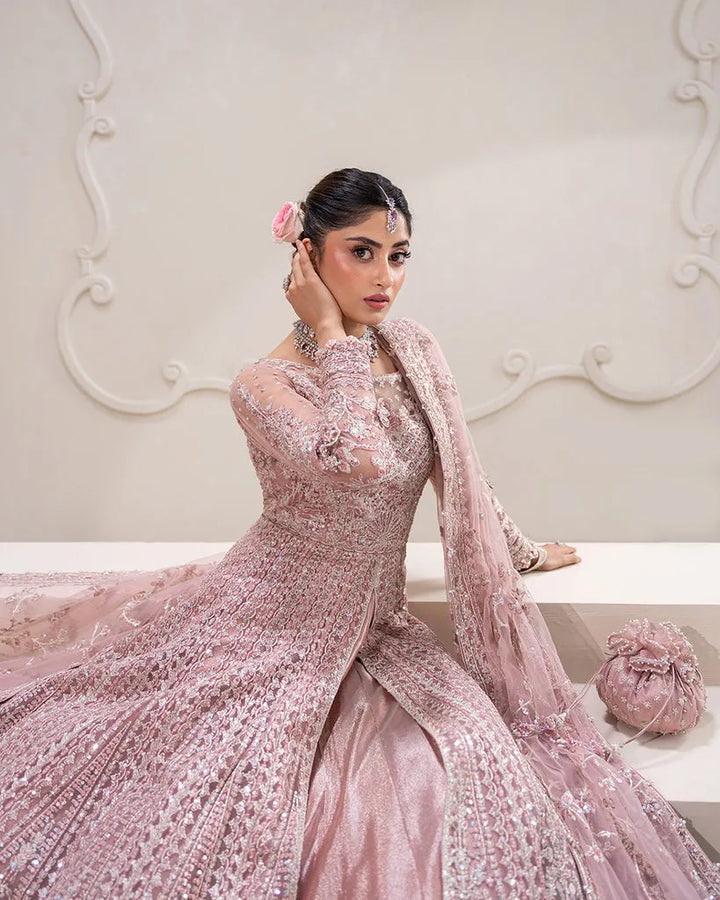 Radiating grandeur, Leyan makes a sublime statement. Rendered on dusty pink net, the shirt and lehenga set is lavishly adorned with intricately patterned embroideries, adding a touch of finesse. The ensemble is further elevated with a diaphanous net dupatta that creates an effortlessly graceful profile, evoking modern femininity with a whisper of timeless charm.