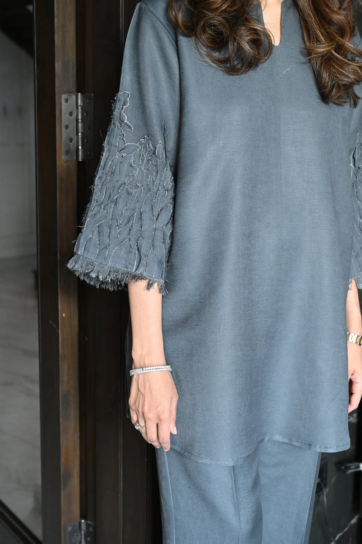 A grey two-piece set featuring a straight-cut kurta with textured appliqué detailing on the sleeves, paired with wide-leg trousers.