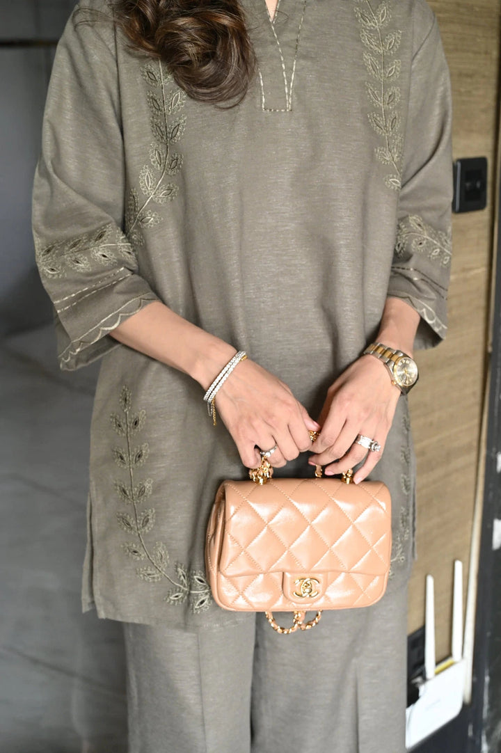 An olive two-piece set featuring a straight kurta with tonal embroidery along the sleeves and hem, accentuated with delicate side motifs. The kurta is styled with a subtle V-neckline and a collared design enhanced with stitch detailing, and is paired with wide-leg trousers for a graceful finish.