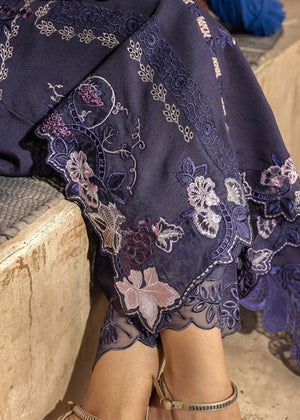 A symphony of winter luxury, unfolds as a refined elegant masterpiece of artistry. Set against a royal deep iris canvas, this ensemble transforms into a regal showcase of intricate floral embroidery in shades of mauve, primrose pink, and purple. Cutwork like embroidery running down the panels dancing with the floral, grape and maple leaf motifs. An opulent purple tone harmonizes beautifully with the divided composition enveloping the wearer in an air of sophistication and regal splendor. Paired with a woolen shawl , gracefully adorned with a scatter of floral motifs, framed with delicate scallop borders on organza. The trousers are enhanced by intricately embroidered borders. A vision of unparalleled winter refinement.