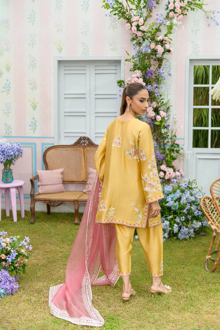 A refreshing summer ensemble from our Zarayna , festive formal collection ,this piece embraces a soft custard hue, elegantly adorned with intricate aari and handwork in shades of yellow, pink, and white. The shirt features delicate tassels on the neckline, adding a playful yet refined touch to the design. Paired with a sleek skinny shalwar, the look is completed with a pure pink kittan organza dupatta, embellished with intricate details that lend an airy, graceful feel. Perfectly suited for the charm of the season.